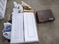 door knobs, cargo net, electric fence controller, mitre saw, bolts, strap wrench, propane heater