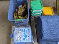 Moving blankets (x2), tarp, deck screws, assorted tools