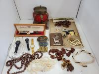 wireless pro 5 blue tooth ear buds w/ charging case, (3) 5 inch white baffle recessed kit, heavy duty wheel kit, butterfly ornaments, kerosene lamps, glass juicers, (18) drawer handles, (20) European cabinet hinges, Coleman lantern, qty of fishing gear, tripod, funnels, level