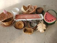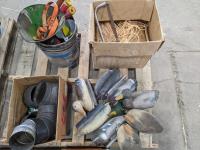 Duck decoys, chimney pipe elbows, box of baling twine, bucket of funnels