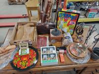 video camera, model planes, diecast cars, antique wash board, oil lamp, antique butter churn, dvd players