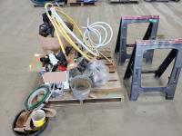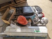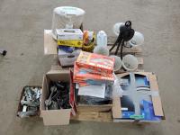 (1) box of light fixtures, Stands, hoses, sump pump, water hoses, face shields & box of plumbing fixtures