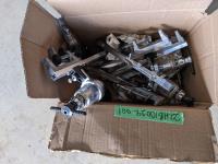 Assorted ball hitches, towing mirrors, saw, locks w/keys, assorted pipes & fittings, pail of screws & chrome head lamps covers