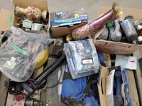 Electric 12v trailer jack, (2) air impact tools, electric chain saw sharpener, wespro 3/4 inch drive air impact & (3) sockets, wespro 3/4 inch drive air impact & 7/8 inch 1-5/16 inch sockets, cooling face covers, antique brass vase with floral design, metal vase, matrix (17) socket set, (240) piece water proof connector kit, spill kit, (2) GD-3000 diesel antifreeze/coolant, orde shoe game, simoniz orbit & qty of sandpaper, 3/8 inch poly rope & good fellows camo lightweight size 9 boots