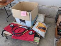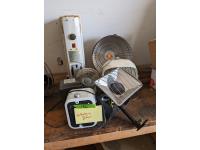 (16) piece solar lights, (2) space heaters, box ratchet straps, work stand, septic pump & portable water pump