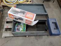Wooden trunk w/ RV & marine toilet treatment kit, 13 inch tile cutter & tackle box w/ assorted rusty tools