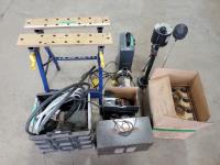 Kitchen faucet (x2), fuel nozzle (new), heat gun, electric shears, boxes of nails & screws, Coleman portable camp stove
