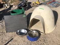 Dogloo dog house, heated water bowl, garabge can with dog food, 22.5 inch X 28.5 inch heated dog mat