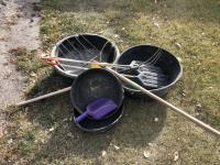 Forks, livestock paddles, electric tank heater, (4) feed tubs, feed scoop