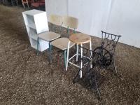 (2) small chairs, small stool, small shelving unit, antique sewing machine stand