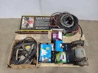Stanley muffler, Bosch 3221 L hedge trimmer, (2) welding helmets, 2 ton chain hoist and tachometer