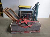 Barrel cart, shelf, desk, (4) screens, (2) sets of folding sawhorses