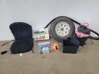 Jobmate shop vac, battery box, seat cushion, A/C recharge kit, slimming belt, Phillips DVD player, 13 inch tire on 5 bolt rim