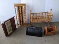 Wood stool, Harley Davidson wooden box, small mantle clock, wood truck