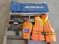 Hobart welding helmet, AC Delco mechanics creeper, adult size medium life jacket, Black & Decker cordless drill and battery