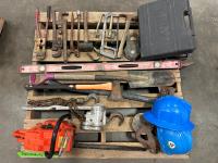 tractor horns, hand saws, manual drill, decorative wall mounts