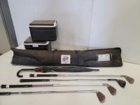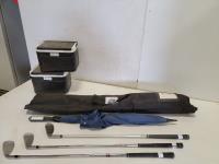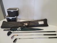 5028 Qty of Right-Handed Golf Clubs, (3) Club Car Coolers, Umbrella, Golf Ball Baskets and Pro-Flag