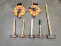 5017 (5) 13 Inch Sledge Hammers, (2) 28 Inch Sledge Hammers, 100 Ft Tape Measure, (2) 300 Ft Tape Measures