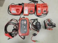 (1) Milwaukee 12 M Charger, (1) Milwaukee 12 M/18 M charger, (1) 12 M/18 M Milwaukee Rapid charger, Motomaster battery charger, battery tester