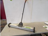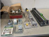 14" Haussmann manual tile cutter, 13" Brutus manual tile cutter, assortment of parts for tracked door systems
