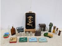 Wooden Kraft cheese box, glass baby bottles, cow bell, camera with flash bulbs, insulators, St Lawrence seaway tray, cologne bottles, candy and cigarette tins