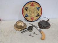 Metal Chinese checkers board, (2) straight razors, cast iron waffle iron, pruning saw, metal hard hat
