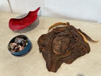 1648 Leather Wall Art, Murano Glass Shell Bowl, Tin of Buttons