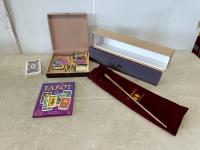 Pokémon cards, wand, tarot cards and book