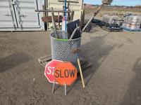 contains stop & slow signs, sledge hammer, hand post hole auger, spade, shovel