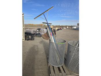 contains (2) snow shovels, (2) landscape rakes, post hole digger