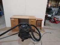 office desk, shop vac, small table, stool, extension cord