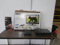 unused 32 inch TV, air compressor, DVD player, VHS player