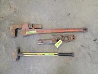 (2) trailer hitches, 60 inch Ridgid pipe wrench, sledge hammer