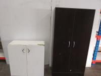 metal white cabinet: 30 inch w x 13 inch d x 30 inch h, MDF brown cabinet 30 inch w x 15-1/2 inch d x 60 inch h