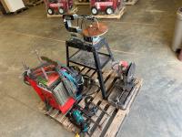 Lincoln Electric AC-225 welder, Makita angle grinder, (3) c-clamps, chop saw, Delta scroll saw, assorted lights, weights, hand tools, porta power, extension cords