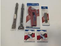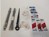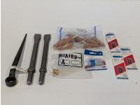 12 inch point chisel, 12 inch flat chisel, (2) oil press install kits 144 inch tubing, universal female coupler, "T" male plugs, torque bits