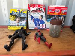 (3) cereral boxes, spiderman action figure, deadpool action figure, jar of marbles