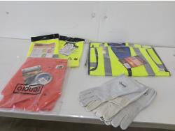 Emergency vehicle safety kit (unused), (1) L/XL safety vest, (6) pairs of nitrile coated work gloves, 12V rotating amber vehicle lamp (unused), snow brush/ice scraper (unused)