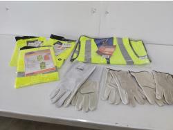 (3) L-XL quilted safety vests, (3) XL safety vests, (2) pairs of XL leather welding gloves