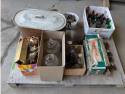 Bottles, cream cans, insulators, sled, wagon
