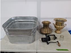 1610 Antique Coffee Grinder, Brass Champagne Basin, Vase and Galvanized Tub
