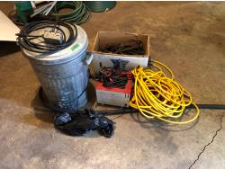 2097 Garbage Can, Assorted Bungee Cords, Extension Cords, Battery Charger