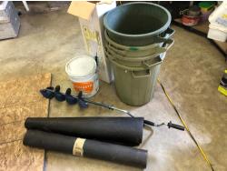 2184 (4) Poly Garbage Cans, 6 Inch Hand Ice Auger, (2) Part Rolls of Tar Paper