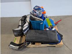Bauer 31 inch senior goalie pads, croquet game set, (3) hockey sticks, baseball glove, bocce ball set, roller blades, baseballs
