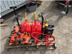 (4) sets of dolly for snowmobiles, (2) jerry cans, (2) Track lifts, (1) motorcycle wheel chock, Jug of snowmobile oil