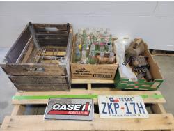 Glass bottles, Young's Dairy box 18 inch x 14 inch x 10 inch, Walker hydraulic jack, blow torch