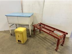5347 Vintage Galvanized Double Wash Basin, Folding Rolling Bench and Trash Can