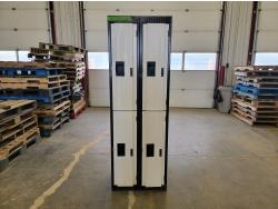 (4) side doors, front bi fold doors, lock box, wood floor