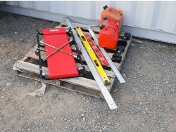 (1) Clarke Creeper dolly (1) 24 inch level, (1) 48 inch level (3) small Geri cans, (1) Tire iron, (1) Drywall square, (1) metal sill plate, (2) Heavy Duty Trailer jack parts.