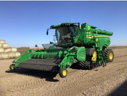 pickup reel, fore & aft, double knife drive, top cross auger, poly skid plates, factory transport, gauge wheels, fits X9 John Deere combine
